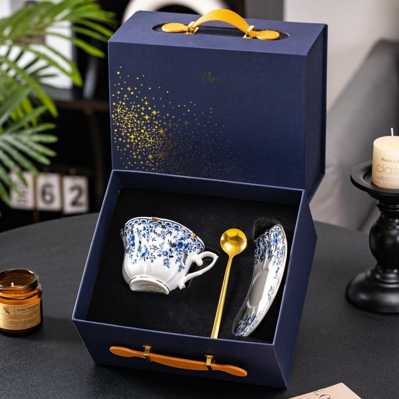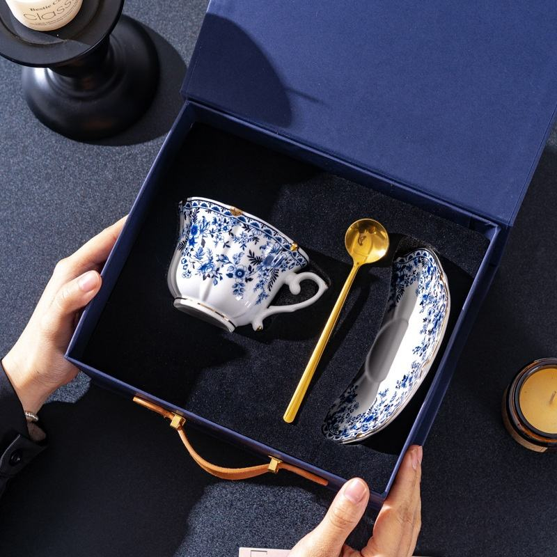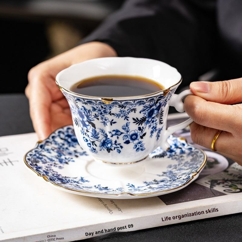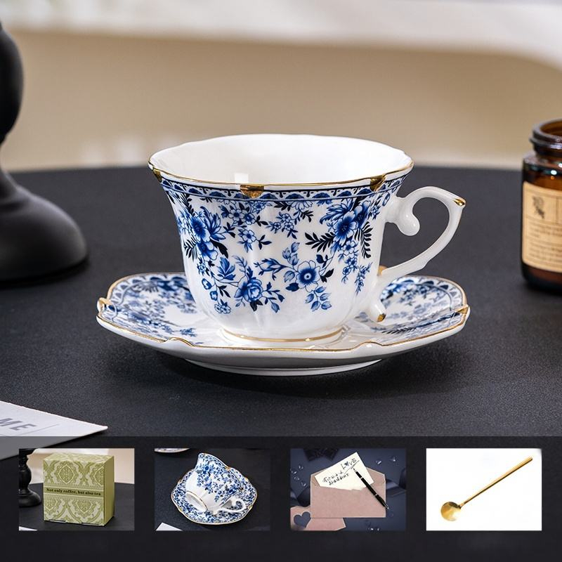 European Style Country Roses Blue White Bone China Coffee Tea Cup and Saucer Set with Gold Rim 240ml Capacity Heat-Resisting