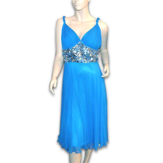 This is a women's evening dress. The dress is in chiffon dress design. It is sleeveless with deep V-neckline. There are silver shiny discs embellishment around the waist.