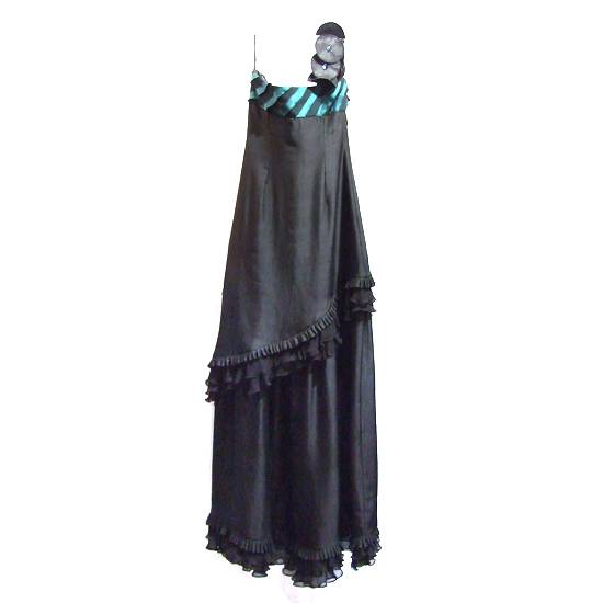 This is a black coloured evening dress which is made of satan silk. The dress is sleeveless, round-necked and is of ankle length. It is decorated with ruffles.