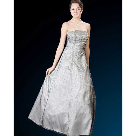 This evening dress exudes a sense of elegance with its simple cut. The beautiful silver dress is adorned with shiny stones with excellent craftsmanship. This gorgeous dress makes it a great choice of outfit for grand occasions.