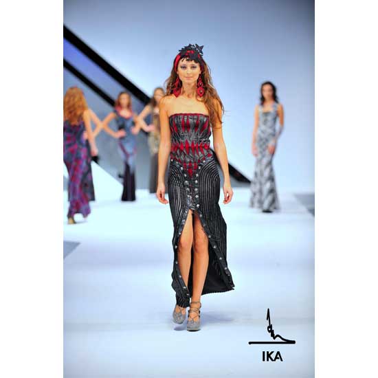 This evening dress comes with a form-fitting strapless bodice and a split skirt. The dress features masculine elements in the metallic studs along the split placket. Red details are added on the black bodice to highlight an exquisite design.
