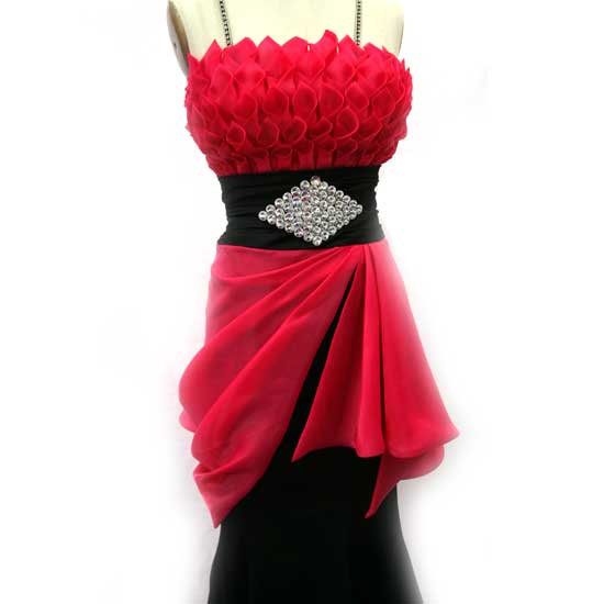 Highlighted is a gorgeous evening dress coming in sharp red. The dress features layers of organza on the bodice and a unique pleated layer at the skirt. The elastic waistband highlights the slender figure of ladies.