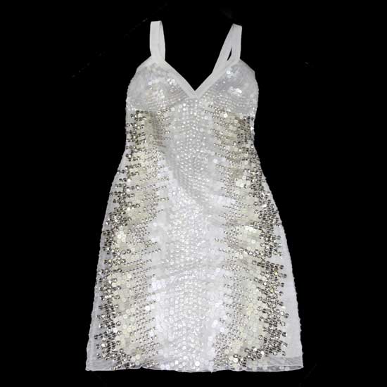 Presented is an evening dress embellished with gleaming sequins. The dress comes with a feminine cut to display your curvy figure. The grandeur piece features a V-shaped neckline for added elegance.