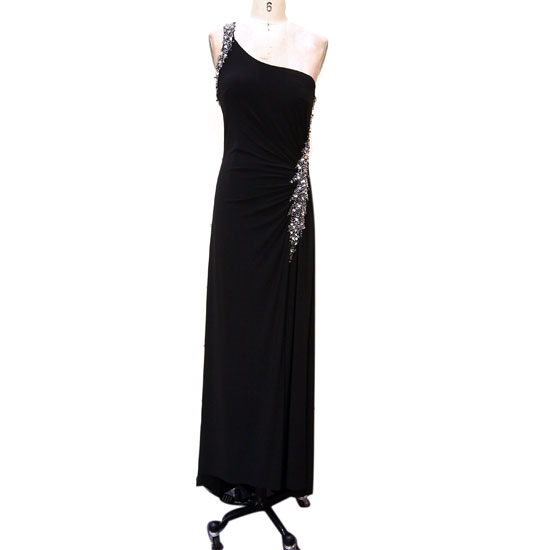This trendy black evening dress spotlights glittering beading accents along the shoulder strap and waist. The flattering dress is perfect to show off wearer's beautiful silhouette. It is ideal for wearing on all types of parties, formal dinners and celebration events.
