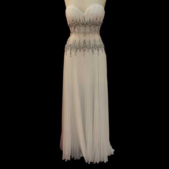 Turn heads at cocktail parties with this alluring snow-white evening dress. This evening gown boasts a sweetheart neckline, formfitting waistline and floor-sweeping pleated skirt. The shimmering silver-tone beads spice up the enchanting piece with aristocratic grace.