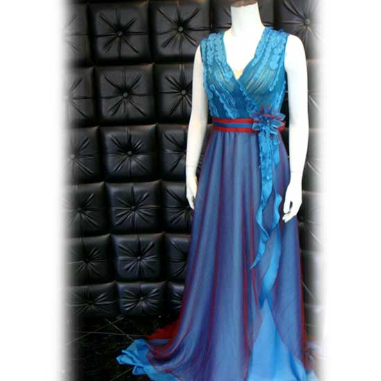 This elegant ladies' evening dress features a surplice neckline and an empire waist. The elegant evening dress is accented with delicate appliqués and beading details. The glamorous and sophisticated dress will make you the focal point at any party.