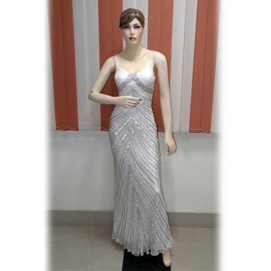 This fabulous evening dress is hand-embroidered with sequins and beads for a sparkling look. The classy dress features a V neck and spaghetti shoulder straps. The slim waistline finishes the design of this stunning piece.