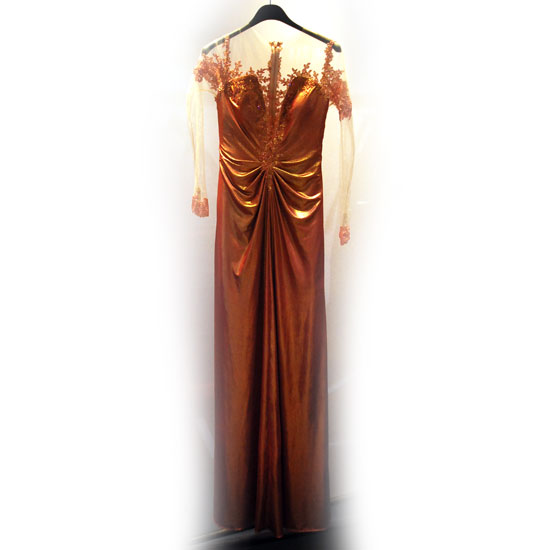 This is a gorgeous evening dress that is finely crafted with lace details for a decorative touch. The subtle pleated trimming adds a touch of style to the whole piece. This elegant evening dress is an ideal addition to complete your wardrobe.