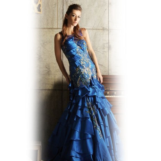 This is an evening dress in royal blue with a sophisticated and elegant appearance. Its skirt comes with multiple layers and pleats for a touch of uniqueness. The golden accents highlight this design for added style.
