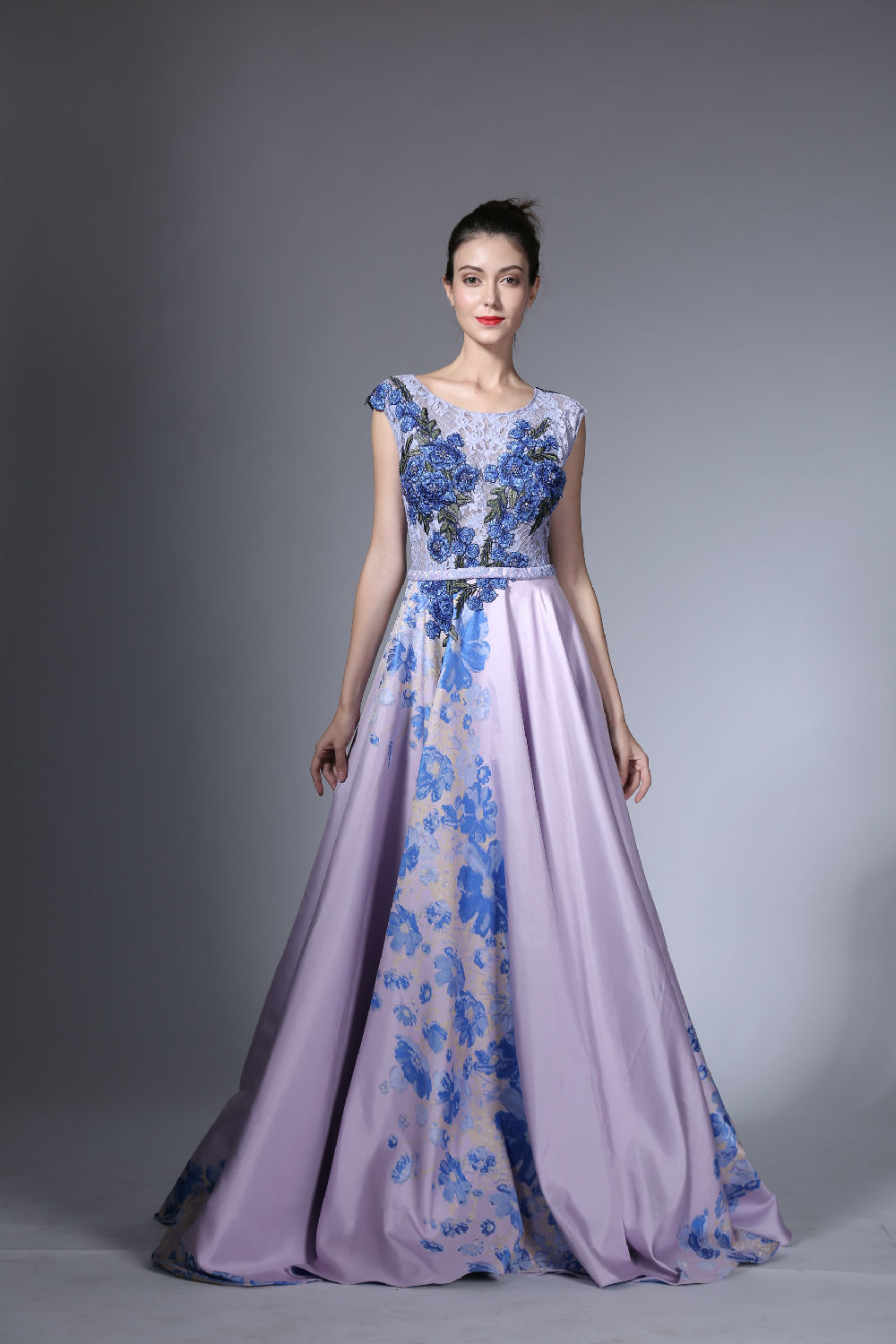 This evening dress is designed by combining the satin fabric and lace adult fashion dress