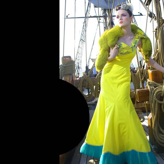 With a sharp and vibrant yellow colour, this evening gown will definitely make you in the spotlight. It features with embroidery of blue and green colour around the neck and along the strap, which adds characters to the gown. It has a fishtail which makes you look elegant and beautiful while walking.