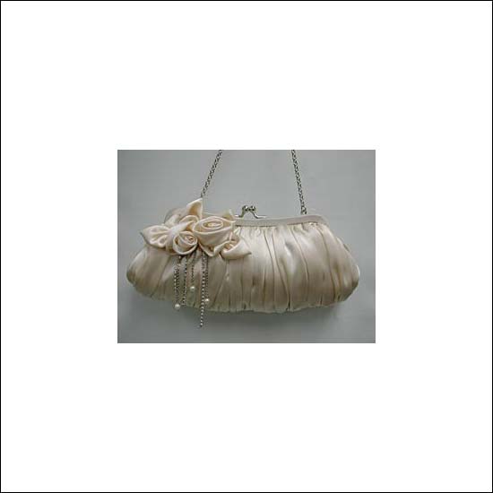 The featured party handbag accents a dumpling shape with a pleated body. The top is coupled with various 3D roses with hanging chains and pearls for a glamorous look. The ivory tone makes it a perefect accessory for attending wedding parties and so on.