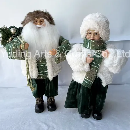 Bring a woodland-inspired touch to your holiday display with the Evergreen Forest Santa & Mrs. Claus. Dressed in deep green velvet trousers and matching skirt, both wear cozy white faux shearling coats and green knit scarves with Nordic patterns. Santa carries a festive gift sack filled with pine greenery and ornaments, while Mrs. Claus wears a soft sherpa hat. This charming duo brings the warmth of a forest cabin into your Christmas scene.