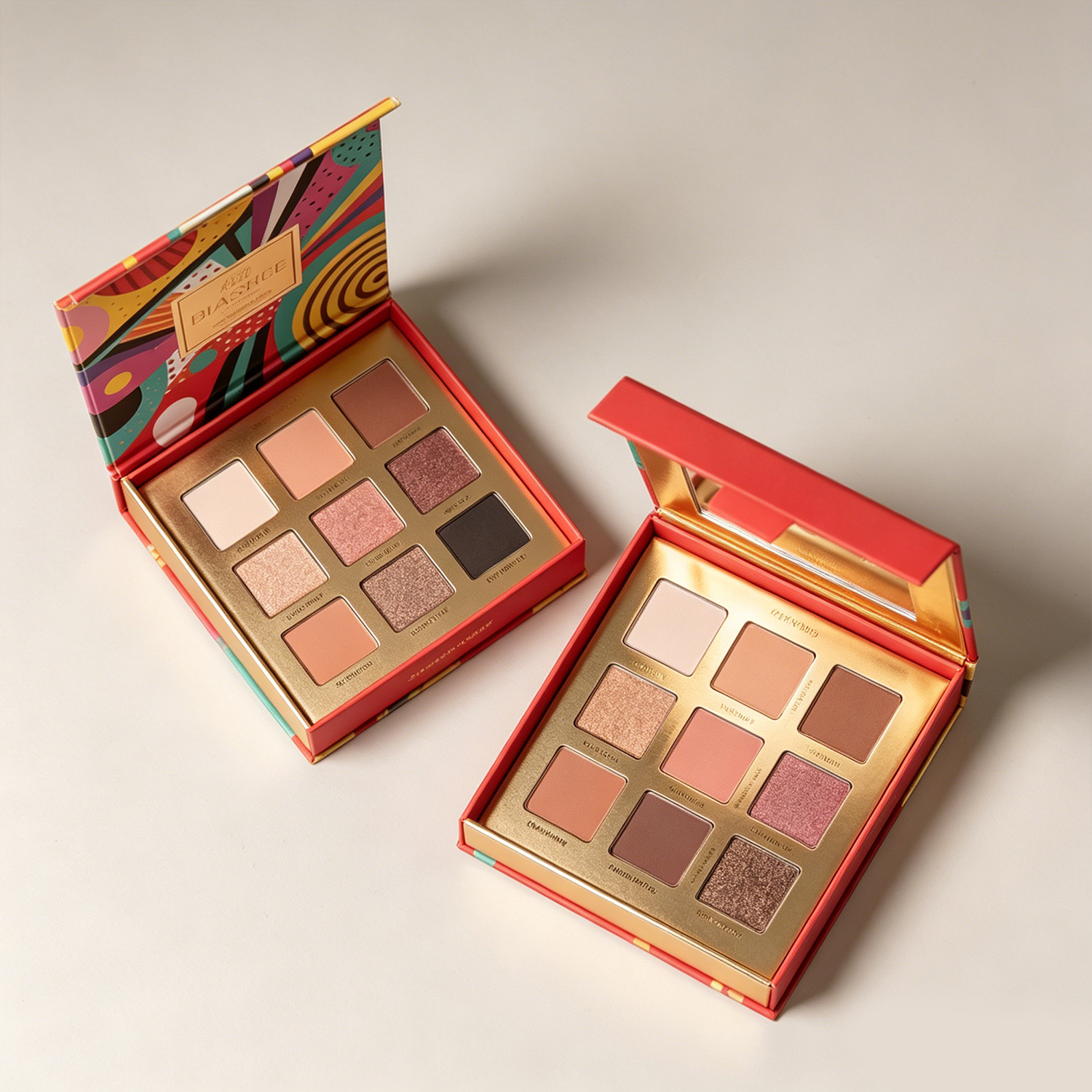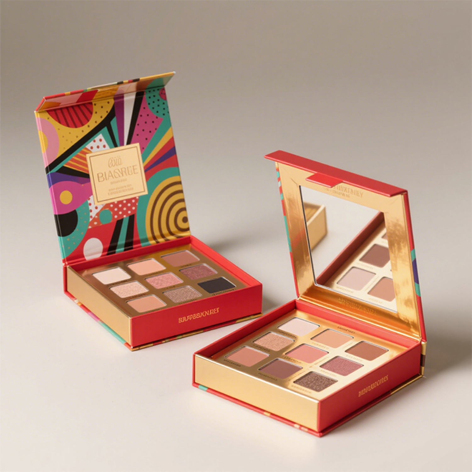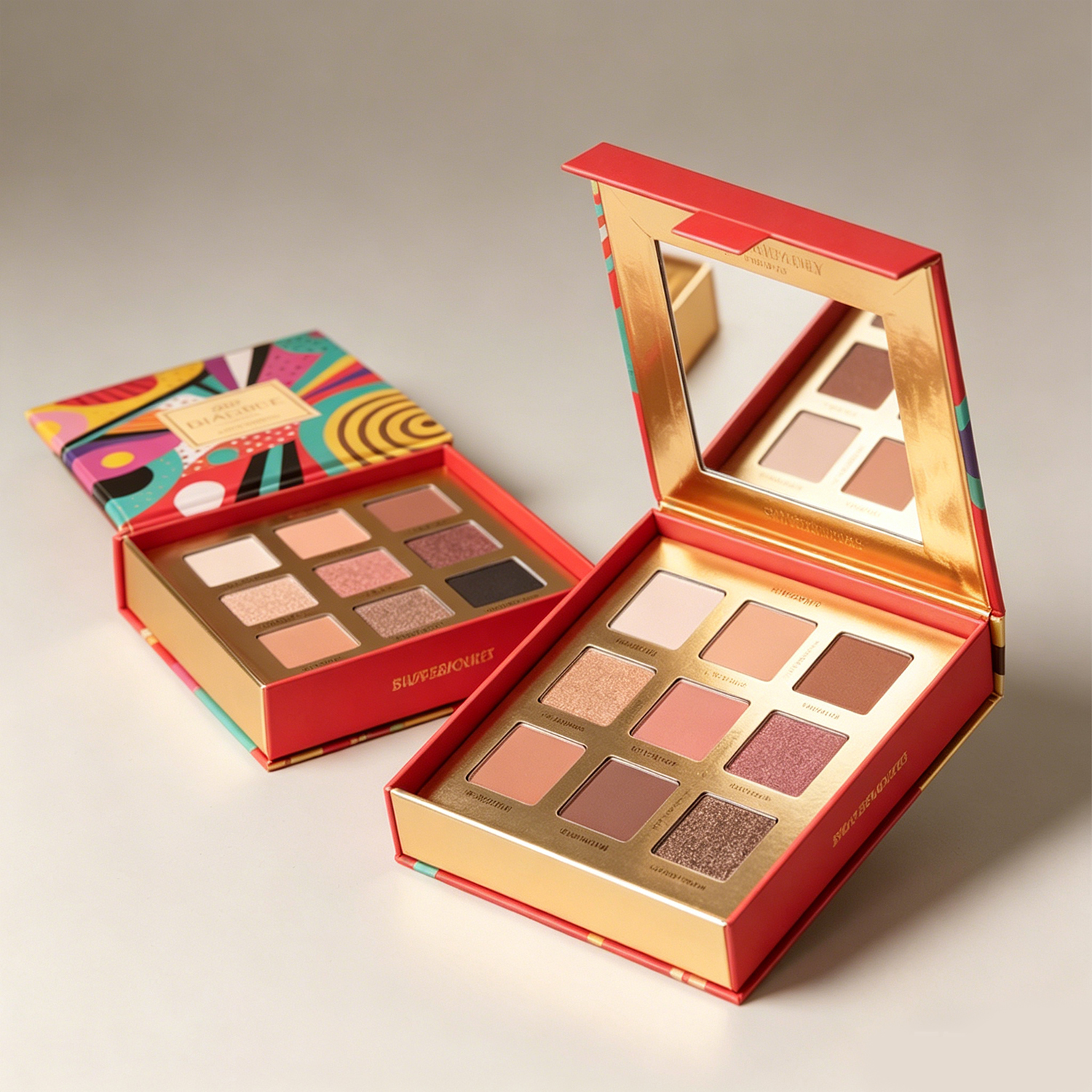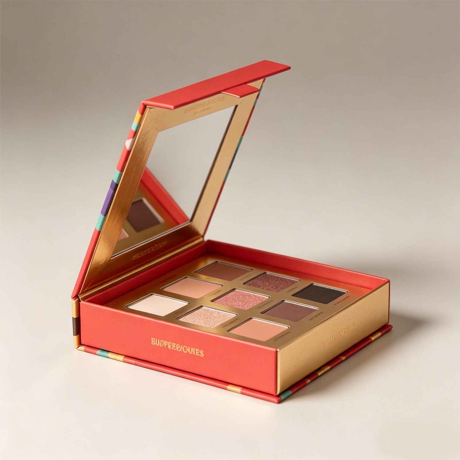 Inside the box, a custom insert tray is designed to hold the cosmetic products securely in place. The insert is tailored to fit items such as eyeshadow pans or makeup compartments, ensuring that each product is neatly arranged and protected.