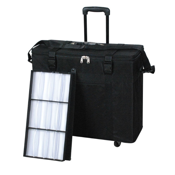 Material: black oxford cloth, fabric and satin lining, zip pocket, and handling and wheels
