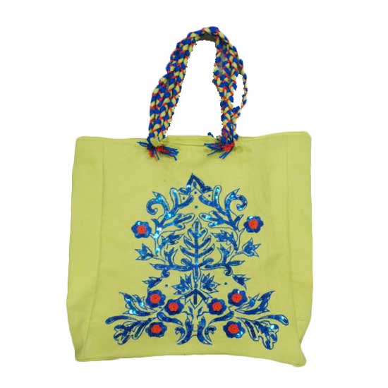 This handbag is designed in bright green with a contrasting and shinny blue tree pattern which is adorned with red flowers. It is completed with multiple colorful rope handles for a perfect finish. This well-made handbag is a great accessory for your casual outfits.