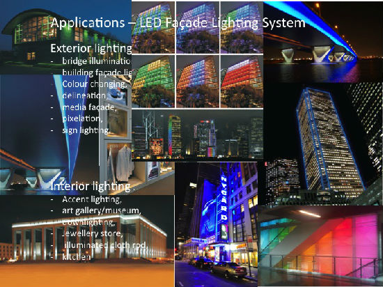 - The proprietary technology was developed for architectural delineation of skyscrapers, bridges, long coves in airports and malls or for wall washing and grazing of long facades. The product was born out of the need for a product that was small in size, had brilliant optical control and could reach great lengths without life limiting restrictions. The decision was made to design the system around 18AWG conductors and limit the current to 10A, with a 380VDC system allowing for lighting circuits up to 3,800W fed from a single power source.