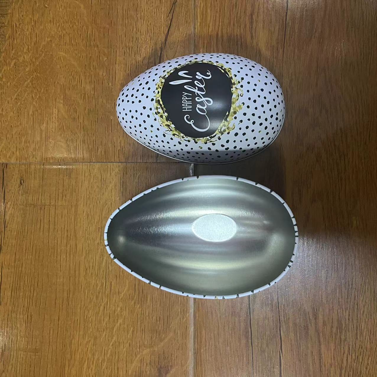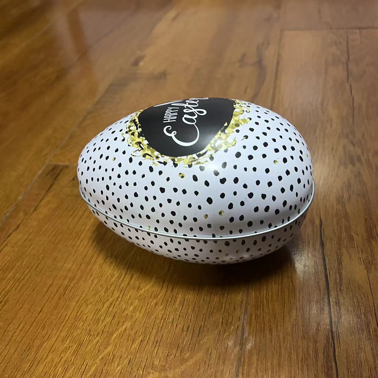Let’s talk style, because this egg is serving it up in spades. The base color is a crisp white, dotted with a sea of chic black polka dots – a modern twist on classic Easter decor that feels fresh and sophisticated. And right in the center, an artfully designed, jet-black oval declares “Happy Easter” in flowing script, framed by a ring of golden brush strokes that look almost like glistening confetti or a touch of glittering magic dust. It’s the kind of design that makes you stop and say, “Whoa, now that’s an Easter egg!” This egg is less about blending in and more about standing out; it’s the cool kid of Easter decorations, perfectly at home in any modern, trendy space, yet nostalgic enough to bring warmth and joy to your springtime celebrations.