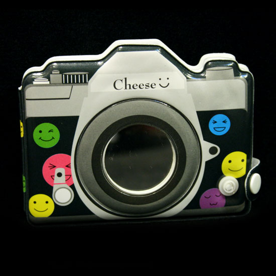 The picture displays a funny notebook featuring the shape of a camera. The notebook cover is printed with numerous colorful smiling faces to light up your mood. The compact notebook can be as a diary or schedule book to be carried around.