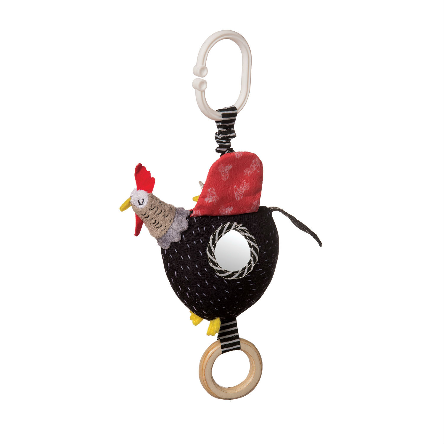 Mother Hen jiggles when you pull on the wood teething ring. This mother hen has a baby that features crinkle paper and tucks away under her wing. Lift up mama chicks other crinkle paper wing to reveal a mirror. Includes a plastic clip for easy attachment to strollers, carriers, diaper bags and more.