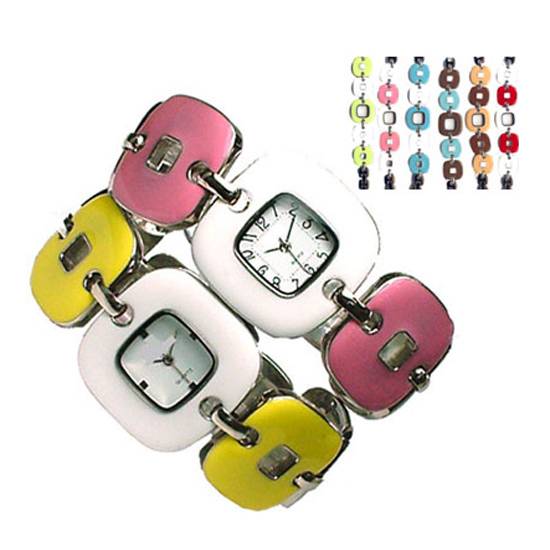 These are fashion bracelet watches for ladies and women. Cushion-shaped alloy cases with enamel coating in different colours are linked together, giving the analogue watches a fashionable bracelet style, which are great for matching leisure wear and smart casual.