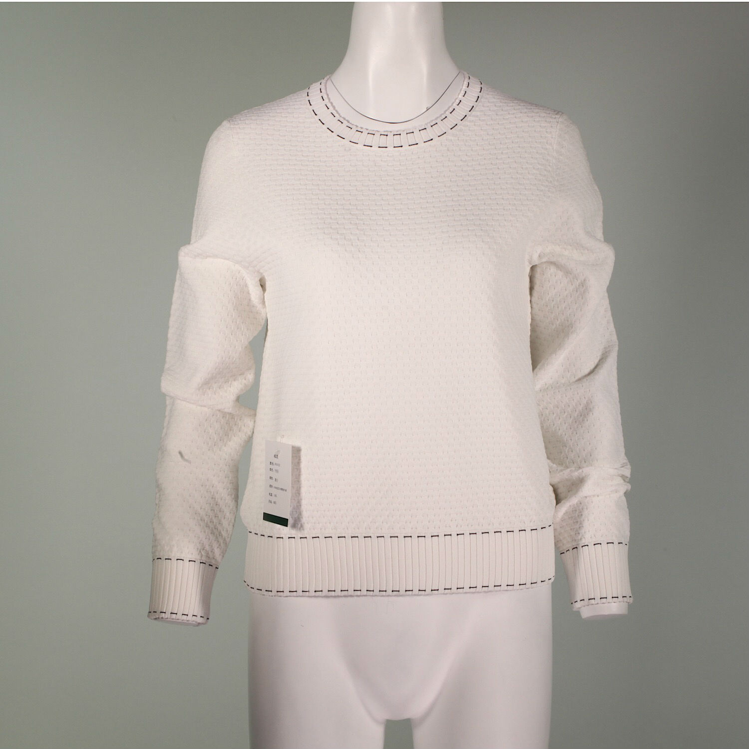 White and black colors are available, a sweater, 80% polyester viscose and 20% polyester, crew neck