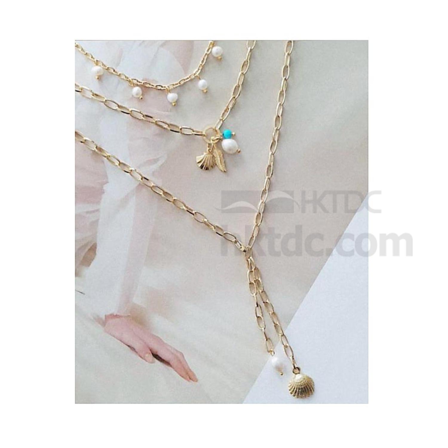 As shown is an elegant trendy necklace with multiple strands each highlighted by metallic accessories.