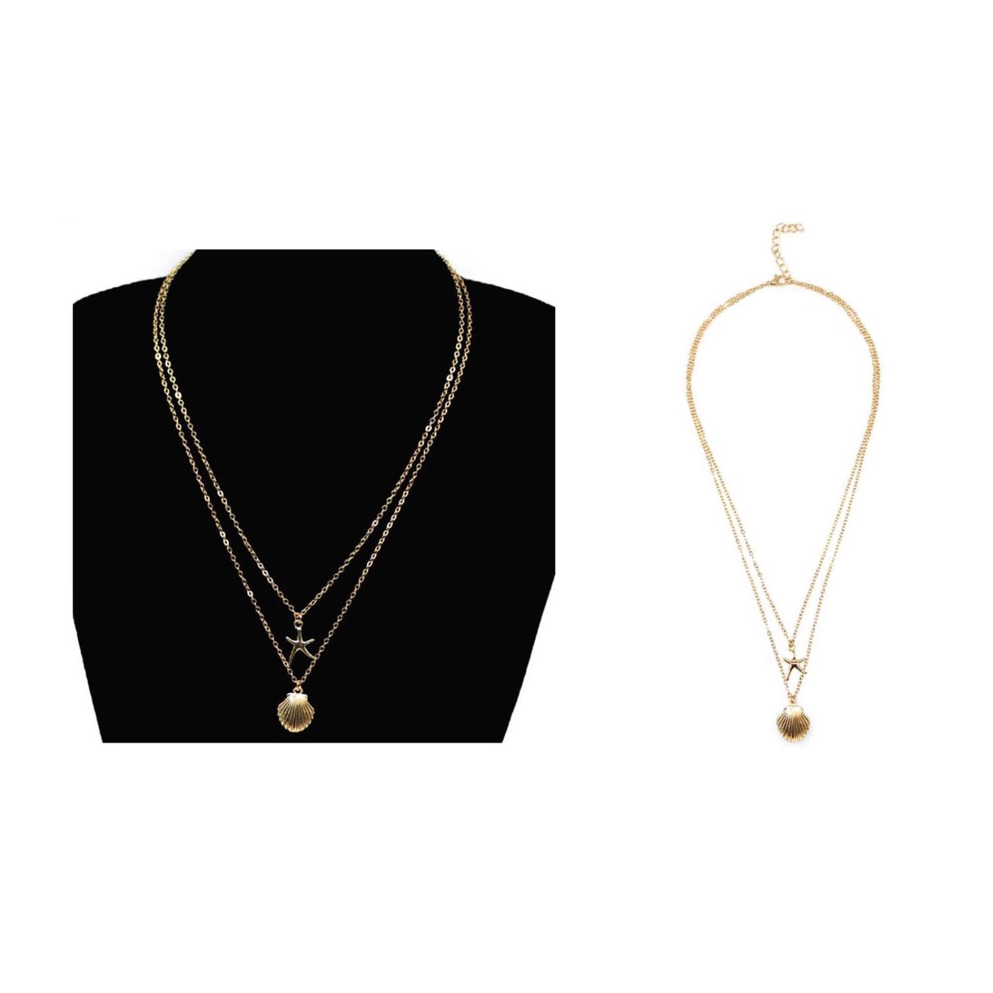 As shown is an elegant trendy shell styles necklace with multiple strands each highlighted by metallic accessories.