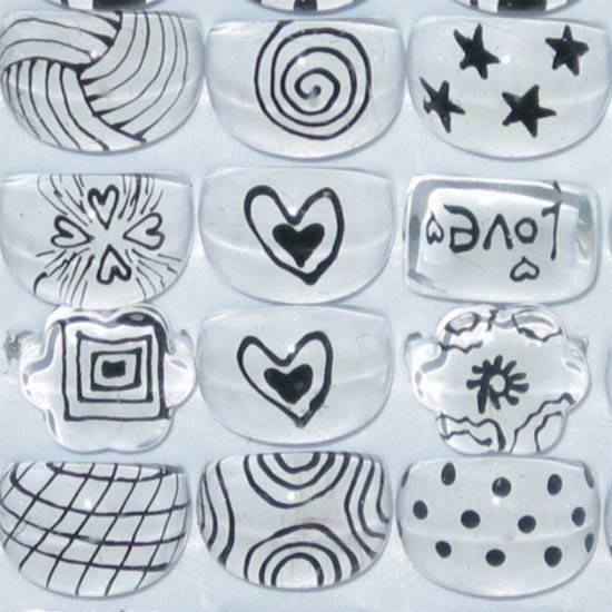 This fashion ring is transparent in color with a black pattern in the middle. The deliberately made irregular pattern is extremely distinctive. This plastic fashion ring is a nice matching item for girls.