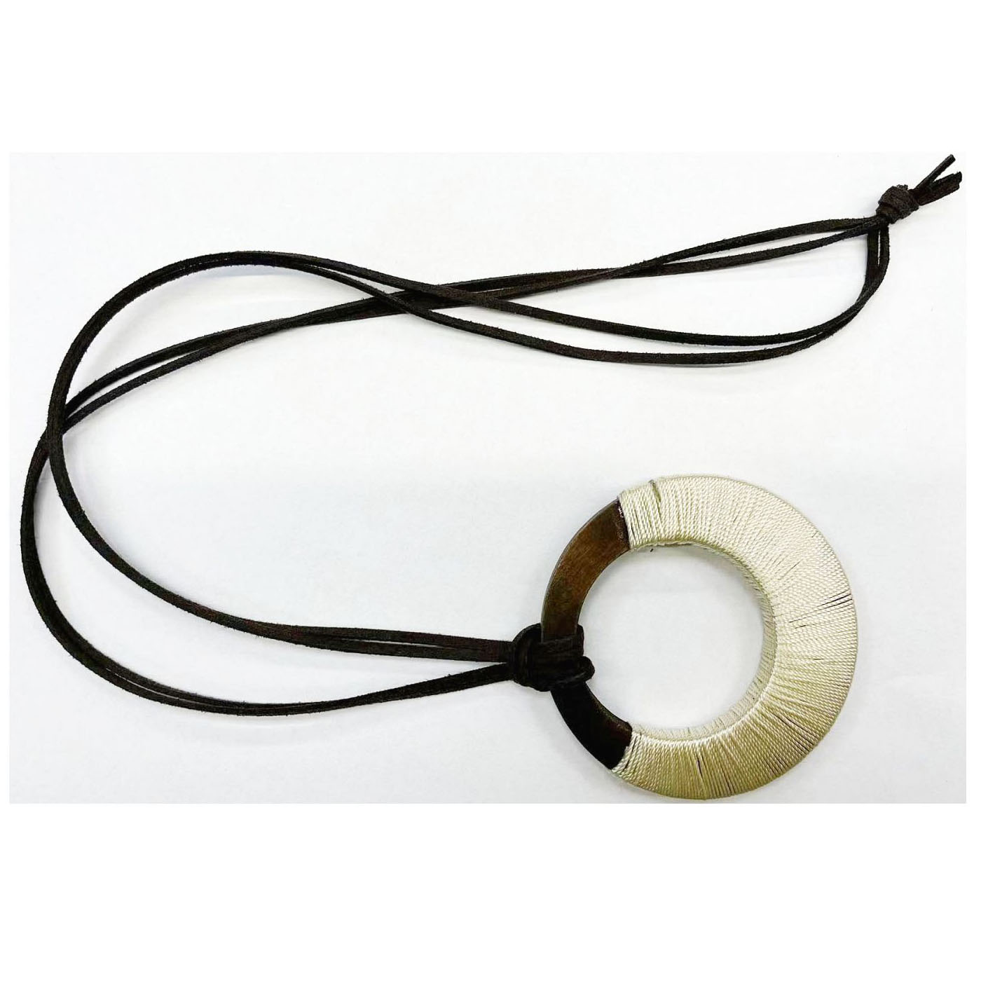 - Material: The pendant appears to be made of dark brown wood or natural buffalo horn. A portion of the ring is covered with hand-wrapped beige or light jute-colored cord/thread. The necklace cord itself is dark brown, resembling suede or braided leather.