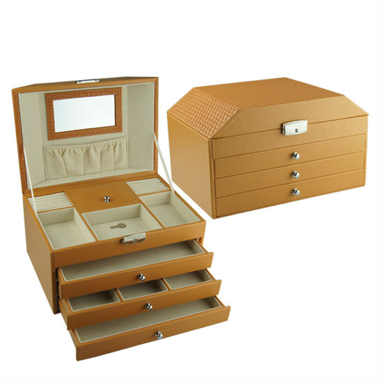 Showcased here is a simple style leather jewellery box.Combine with the light browm pu and metal,show a simple and strong feel.The top of the box is woven pattern,it is a bit countryside feeling too.The box brings many kind of the feeling to you.