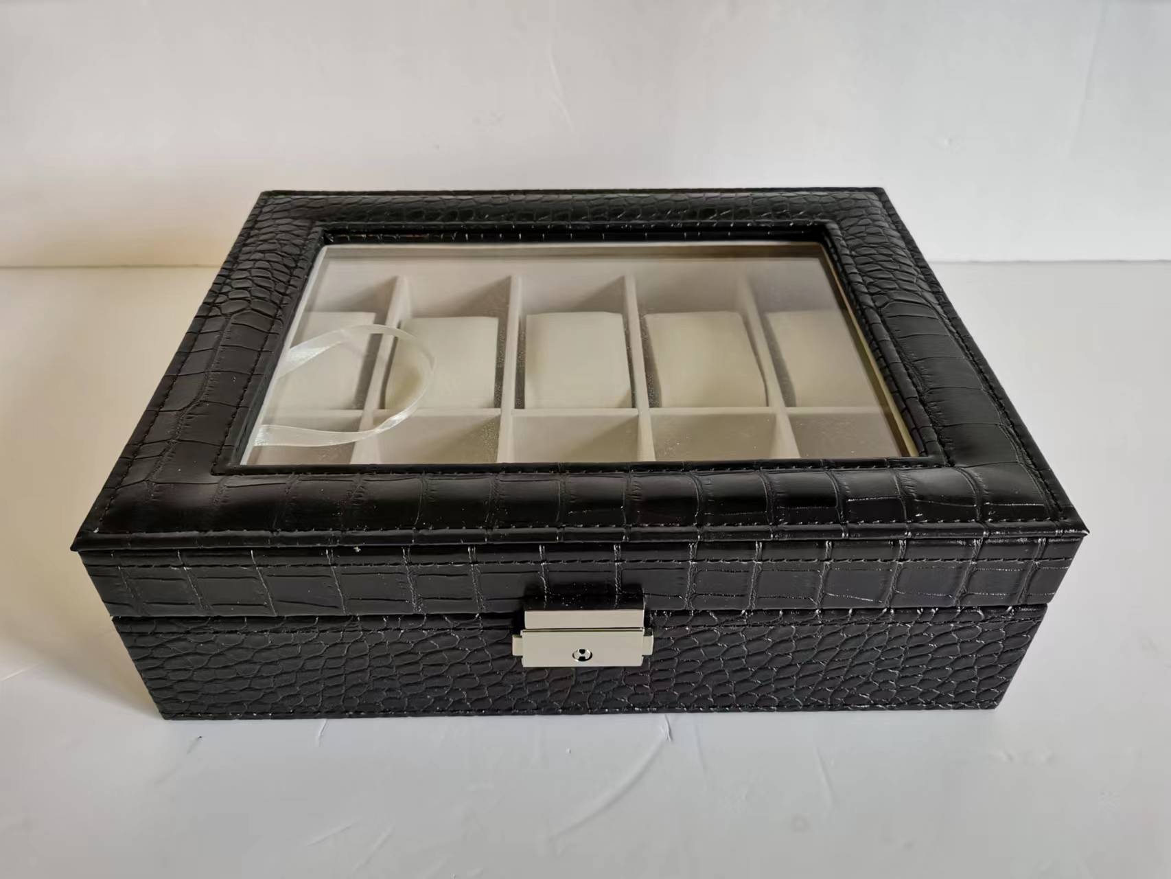 Store your precious watches elegantly with this watch box. It is made of PU which gives a leather-like look and superior durability. The box includes a see-through lid panel and 10 grids to individually organise and store your watches.