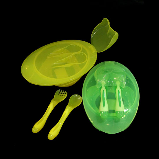 The feeding bowl set is finely made of tasteless and non-toxic material. It comes with a fork, a spoon and a bowl. This feeding bowl set is an ideal choice for outgoing use.