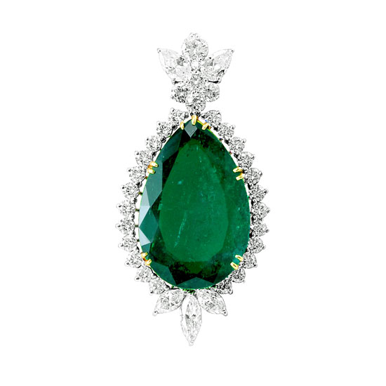 This is a beautiful pendant centered with a large Colombian pear-shaped emerald stone. The stone is encircled with round and marquise diamonds for added luxuriousness. This pendant surely is a great accessory for your high-fashion outfit.