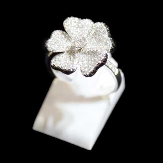 This elegant finger ring features the design of a 5-petal flower. The ring is micro-paved with white diamonds in the 18K white gold setting. The ring band showcases a polished finish.