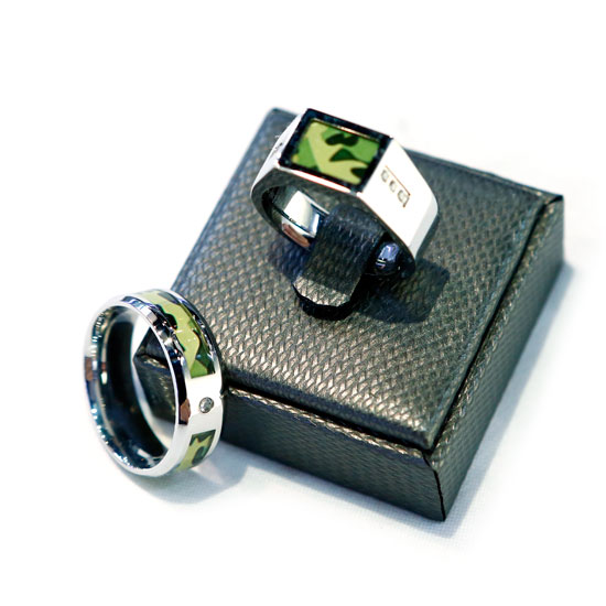 This is a series of finger rings in different designs. Each piece is made of silver with excellent craftsmanship. The army green camouflage insert adds a touch of uniqueness and style to this series.