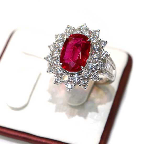 This finger ring appeals to people instantly with its deluxe and alluring appearance. It is highlighted with a red ruby stone with an oval cut. The sparkling diamond elements complement this design for added glamor.