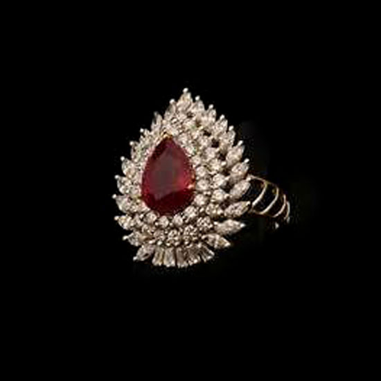 This finger ring appeals to people instantly with its deluxe and alluring appearance. It is highlighted with a pearl-cut ruby stone centerpiece. The sparkling diamond elements complement this design for added glamor.