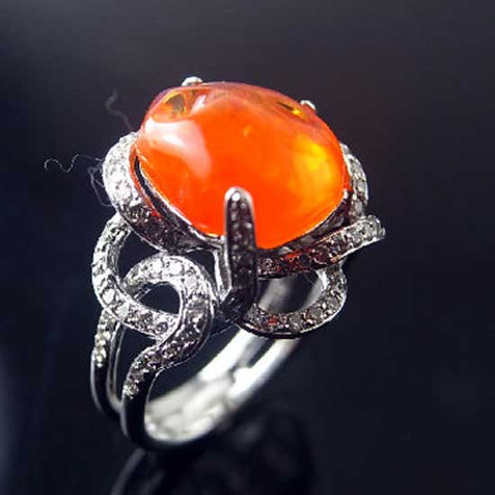 Twist lines bring out the stylish design of this stunning fire opal ring. Well-cut diamonds are used to provide the quality and the strong contrast of the color. This gorgeous diamond ring complements you alluring evening dresses in a beautiful way.