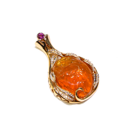 This is a fashionable pendant that features a large opal gemstone as the centerpiece. The allover dazzling small stones are well mounted on the 18K yellow gold setting. This elegant pendant is an ideal addition to complete your jewelry box.