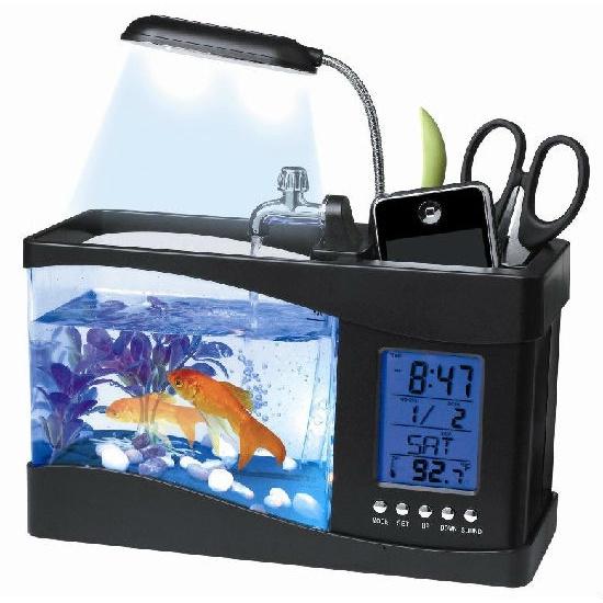 Enjoy this compact illuminated fish tank with its built-in radio, pen holding compartment and LCD display of all the essential information. Conveniently powered either by USB and DC power supply, this mini aquarium takes up minimal space in your office or home while offering an impressive list of functions.