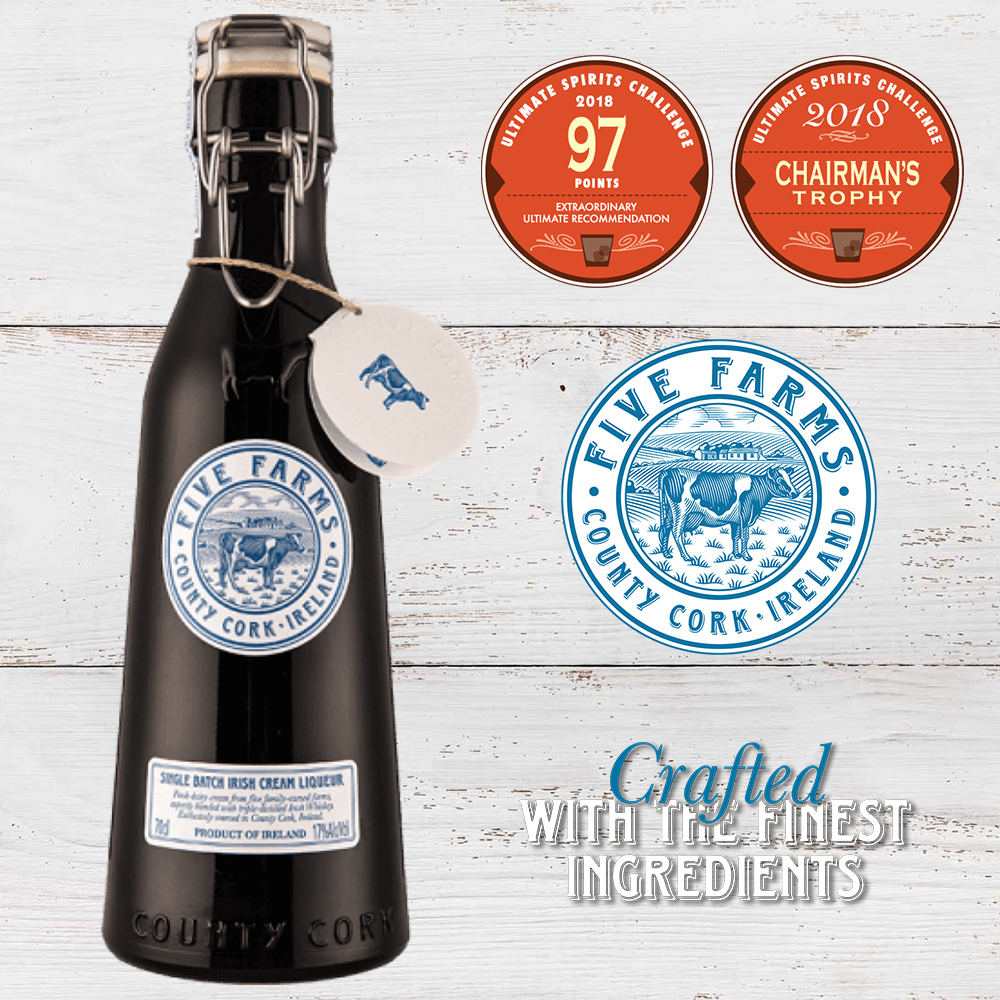 Five Farms is a true farm-to-table product, crafted from single batches of fresh cream that are combined with premium triple-distilled Irish Whiskey within 48 hours of collection to become authentic Irish Cream Liqueur. The cream is sourced entirely from five family-owned farms in County Cork, run by families that have a deep connection to the land and a passion for their craft。