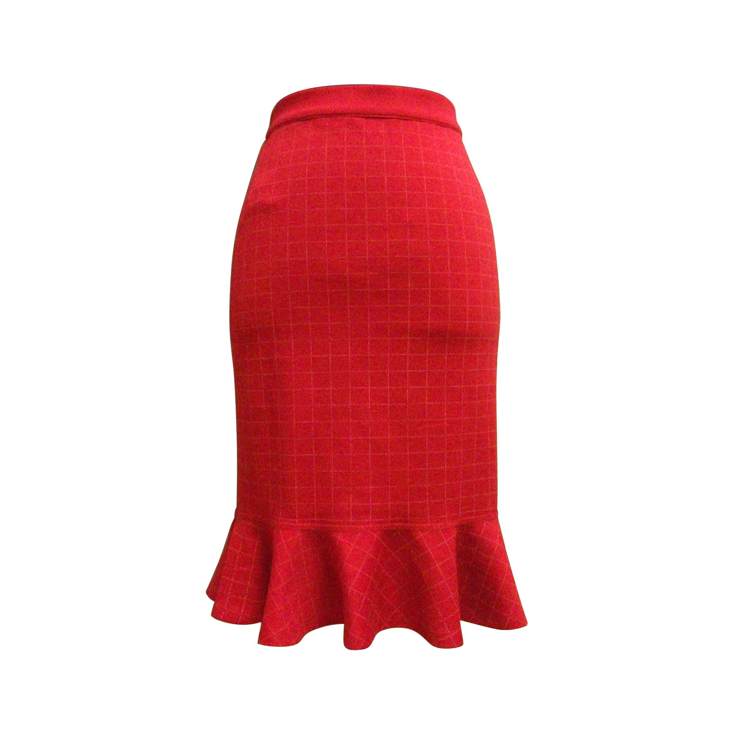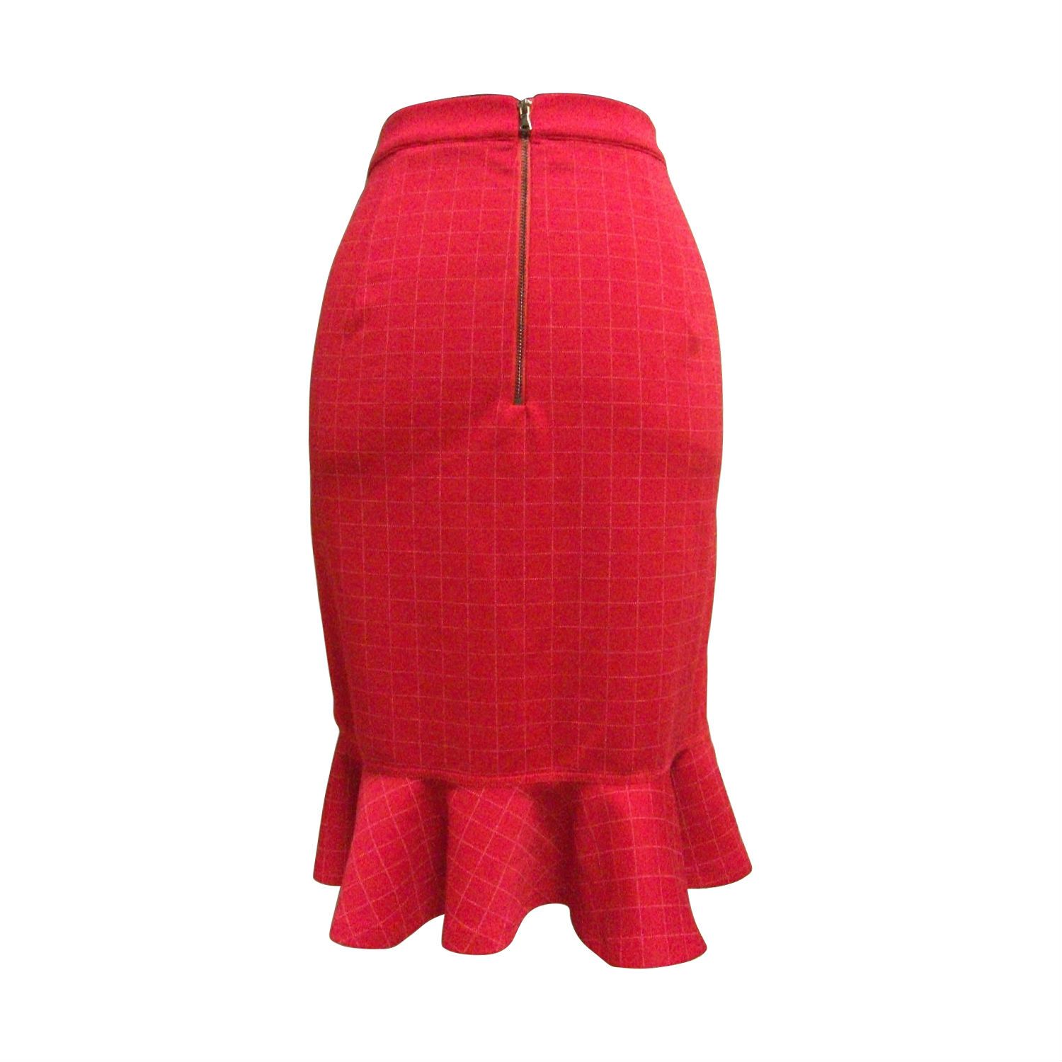 Straight skirt with bias flare bottom, self-fabric waistband with back zipper closure,