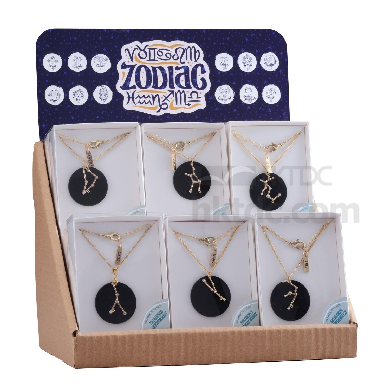 A set of zodiac jewelry, each with the constellation and horoscope name with beautiful black agate disc as backdrop representing the shining bright stars at night.
