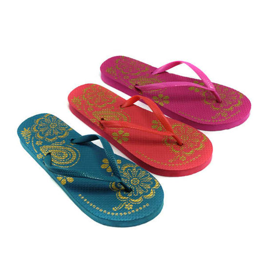 Presented are flip-flops designed for you to wear on the beach. The outsoles are made with rubber to absorb shock and provide comfort for the feet. The PVC uppers are durable upon all-day wear.