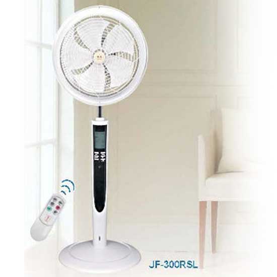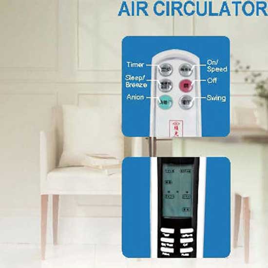 Displayed is a floor fan with a high performance of circulating indoor air. Featuring a remote control, this fan can allow you easily adjust the settings for a more enjoyable experience. This floor fan is made to be of high quality so that you and your family can enjoy pleasant breezes all year round.