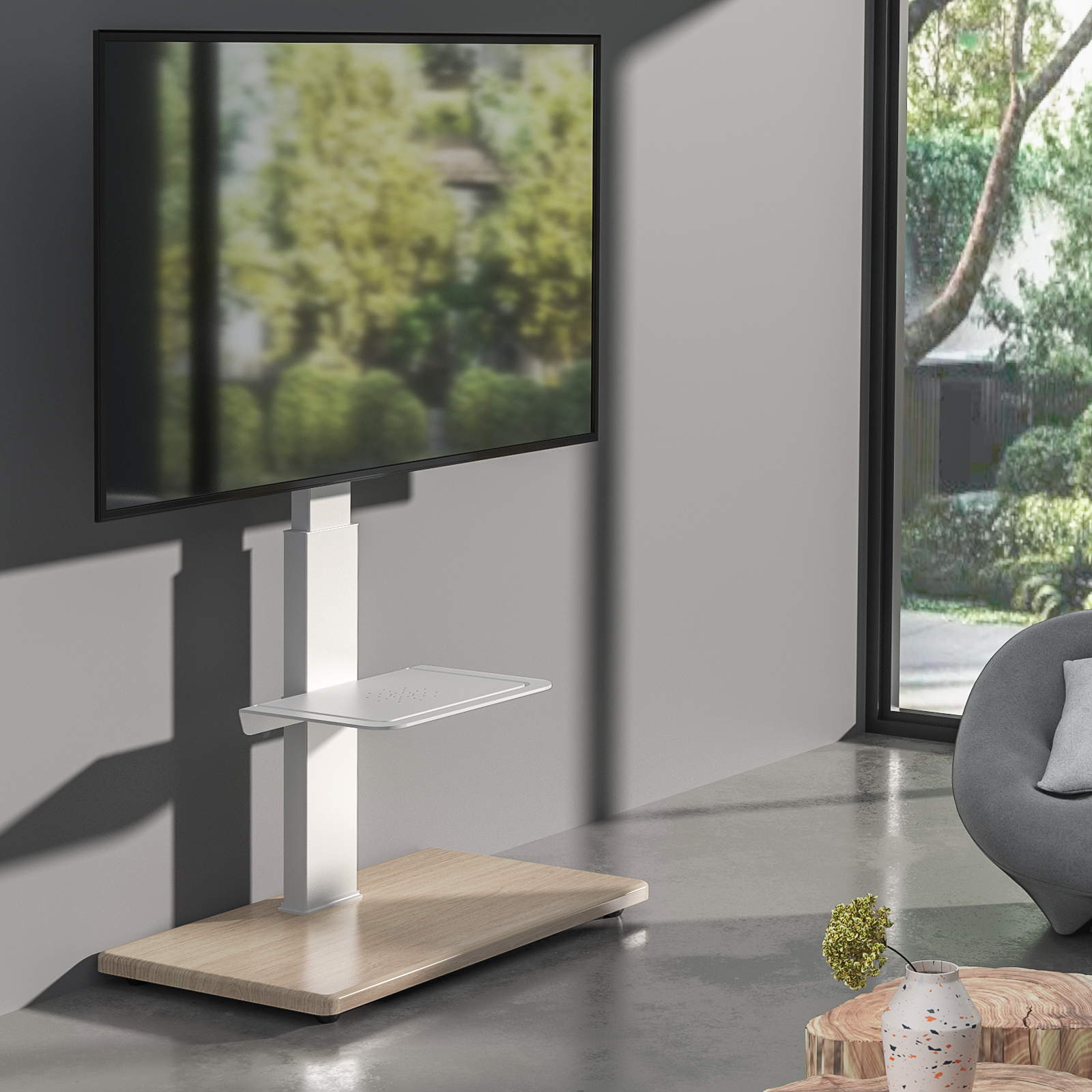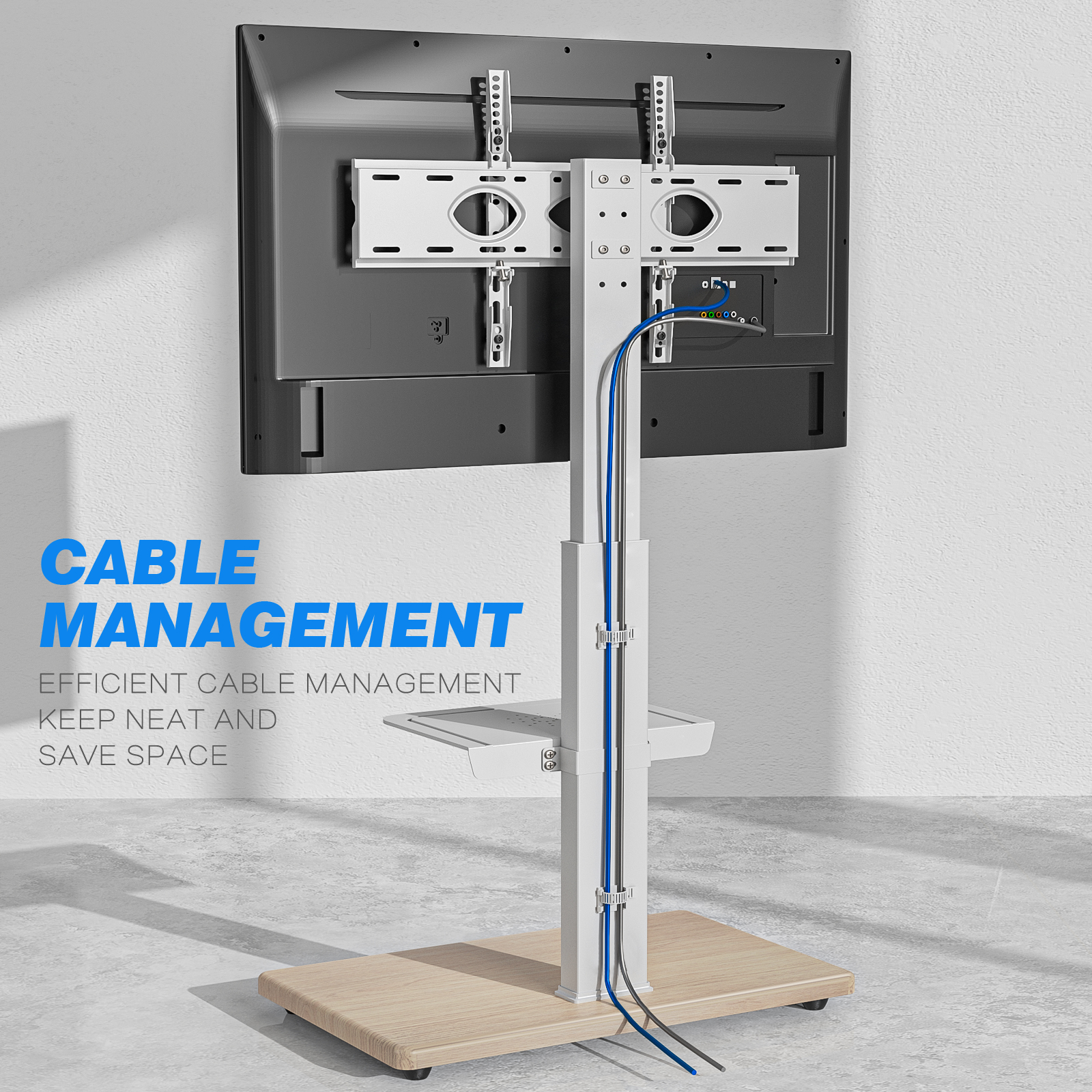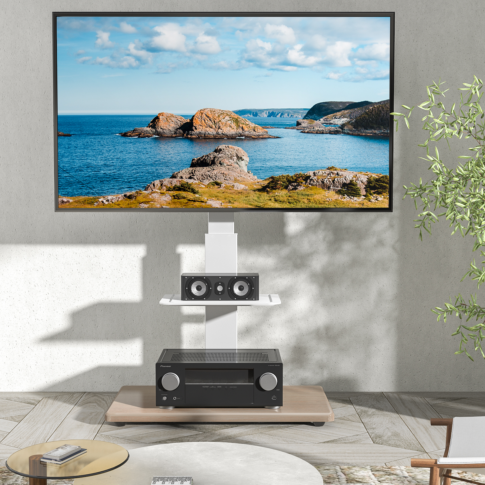●[STORAGE&WIRE MANAGEMENT]This tv stand with mount is equipped with two removable metal shelves and a hard wood base to hold yor A/V components, cable box, DVD player or gaming systems. To keep your place tidy, it features a wire management solution to organize and conceal the wires or cables in the back of the stand.