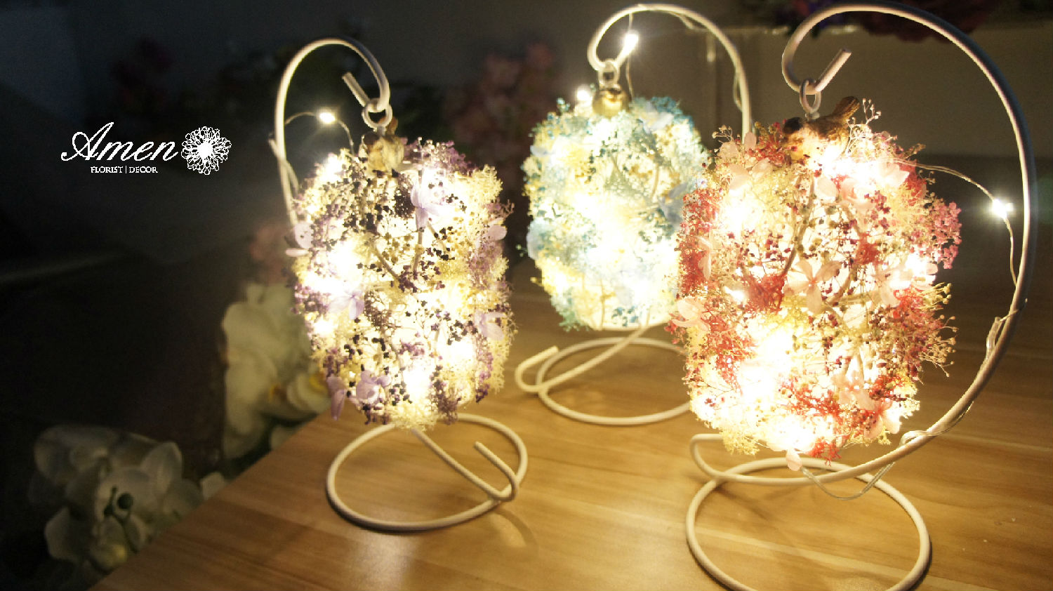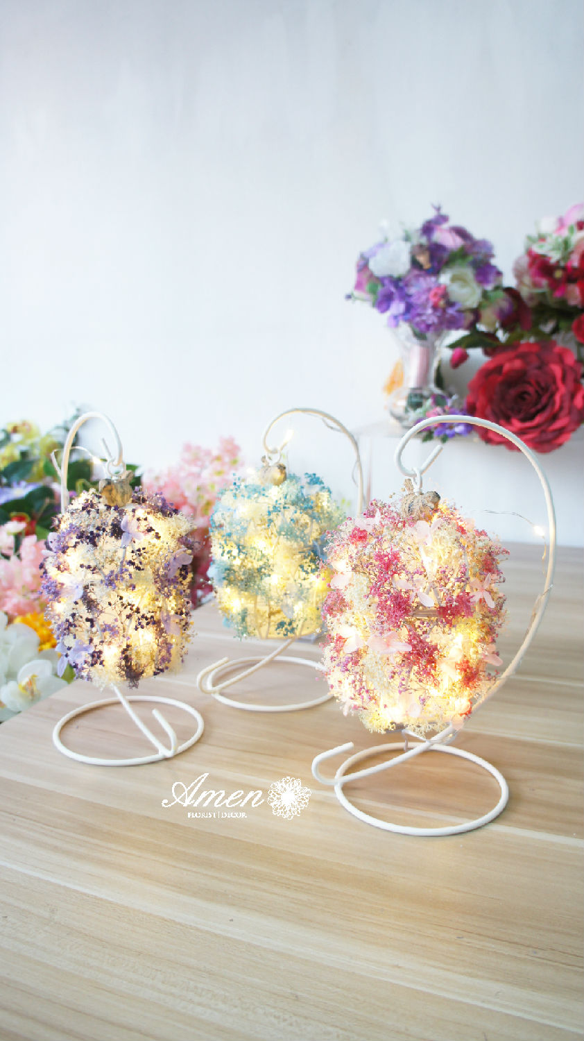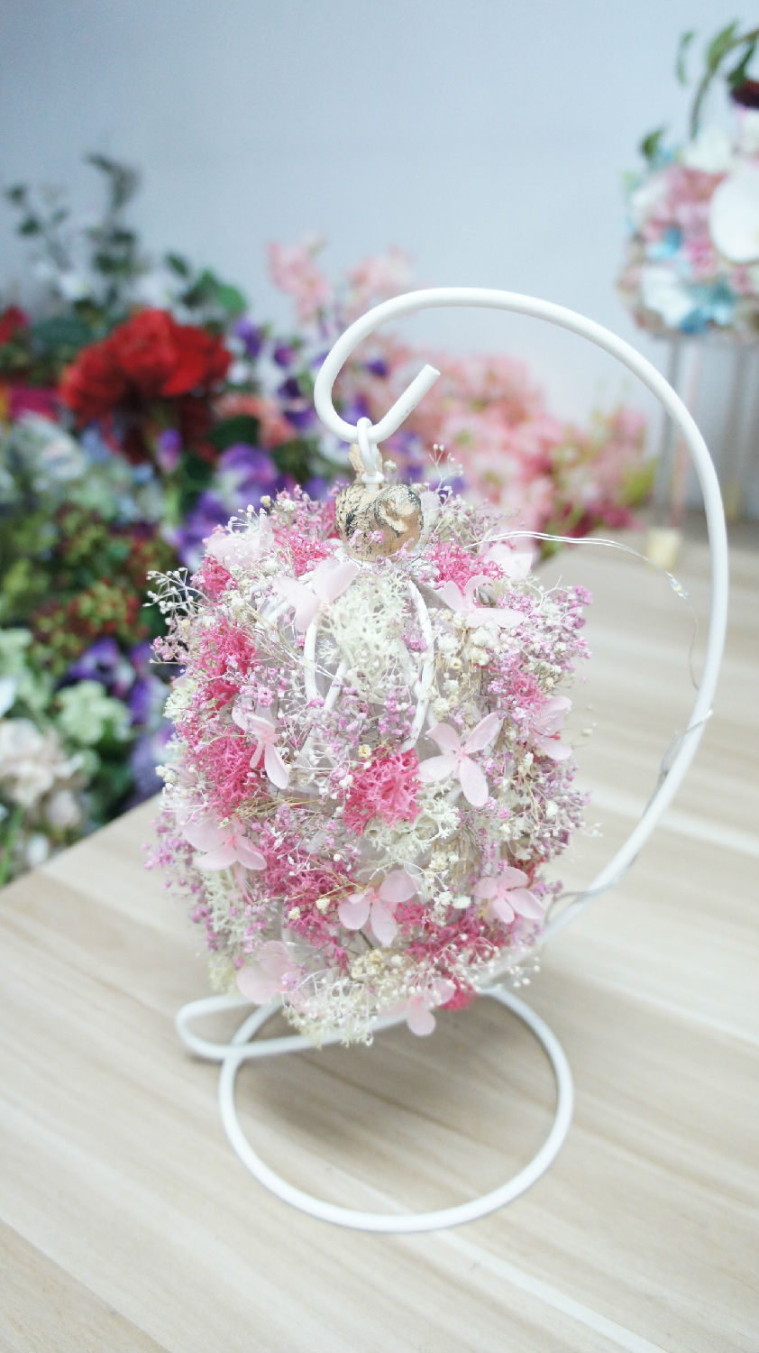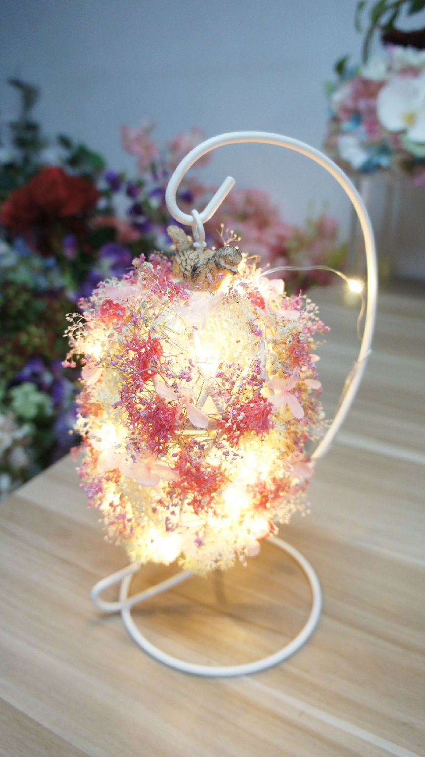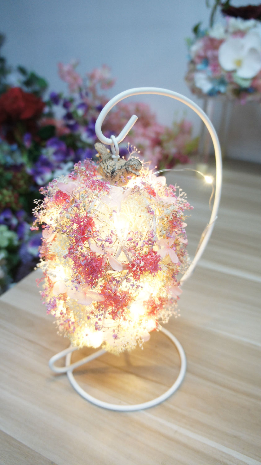 The colorful preserved flowers are in bloom in a well designed LED birdcage table lamp.