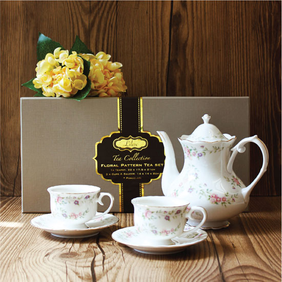 This tea set with a Victorian design is extraordinarily elegant. The teapot and 2 sets of cups with saucers are finely embellished with elaborate floral patterns. You can use this amazing set to serve your afternoon tea.