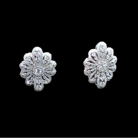 These flower earrings feature an intricate design. The earrings are micro-paved with white diamonds in the 18K white gold setting. These flower earrings will add a touch of elegance to any lady's look.